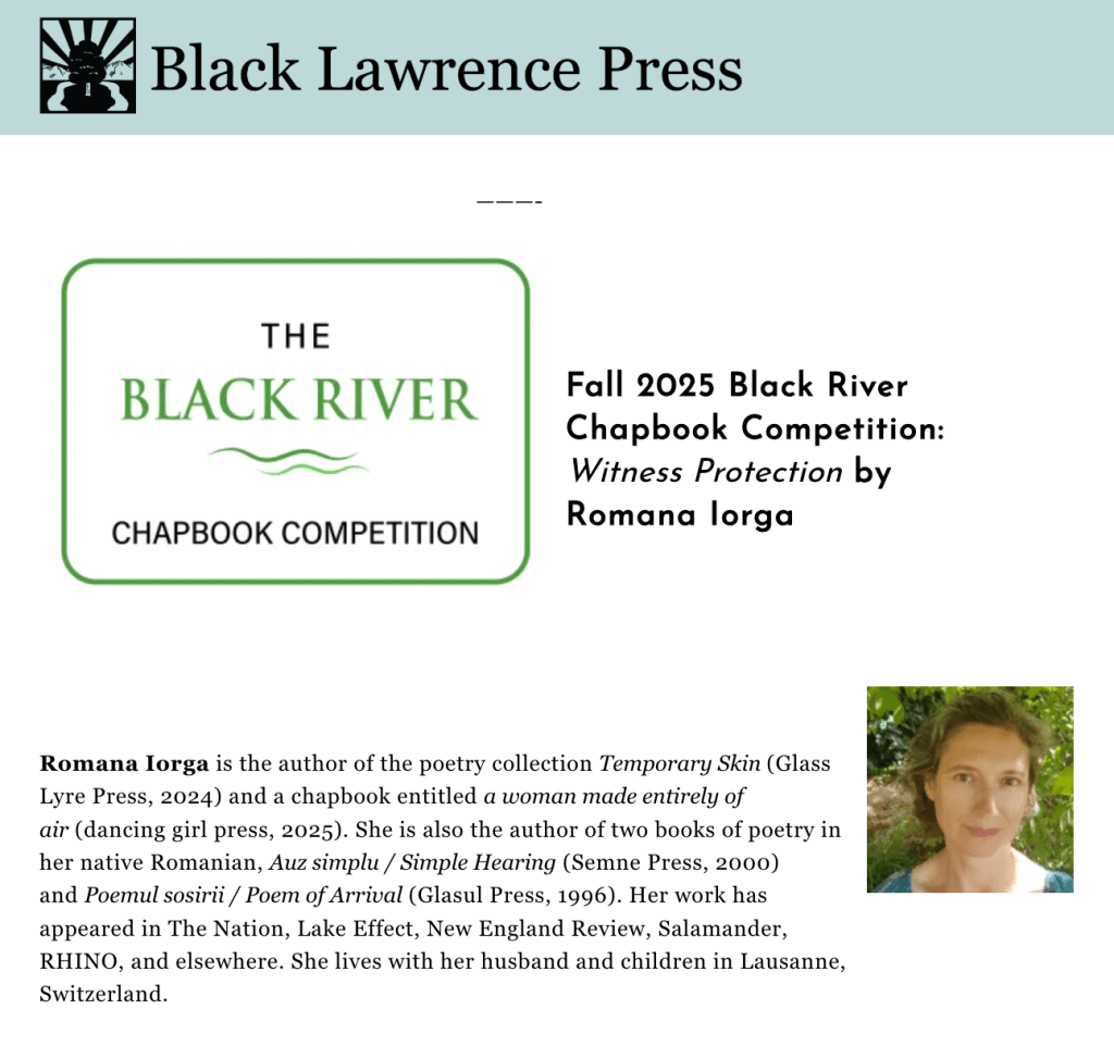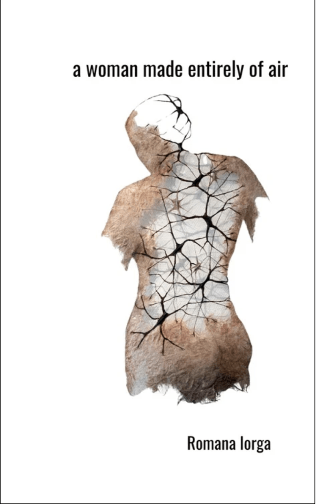 “In this rivetingly poignant collection, a woman made entirely of air, Romana Iorga asks, “what / am i / if not / a boat made of flesh / carrying words from one / shore of your absence / to another?” Iorga’s delicate poems, intricately interwoven with caesuras, create a beautiful lacework of memory, trauma, and grief. These poems are a meditation on breath, breathlessness, silence, silencing, absence, and erasure. Here, Iorga seamlessly moves within the transitory, the hospice between shores, the Bardo of the in-between. These are hauntingly exquisite poems.”